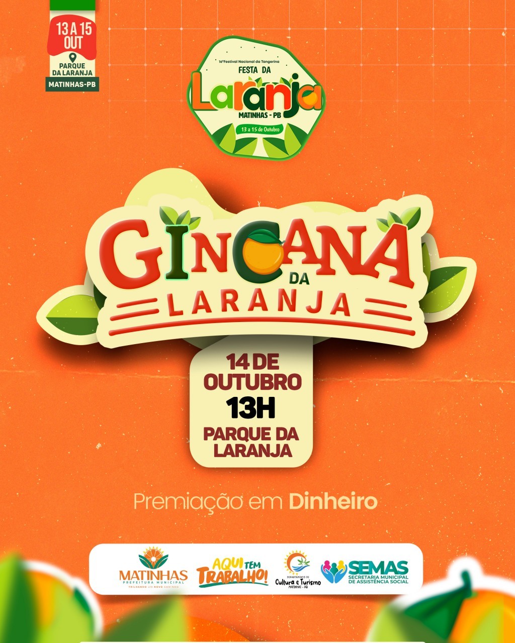 A Prefeitura Municipal de Matinhas, através da Secretaria de Assistência Social, por meio do Departamento de Cultura e Turismo, realiza no dia 14 de outubro, a Gincana da Laranja 2023.