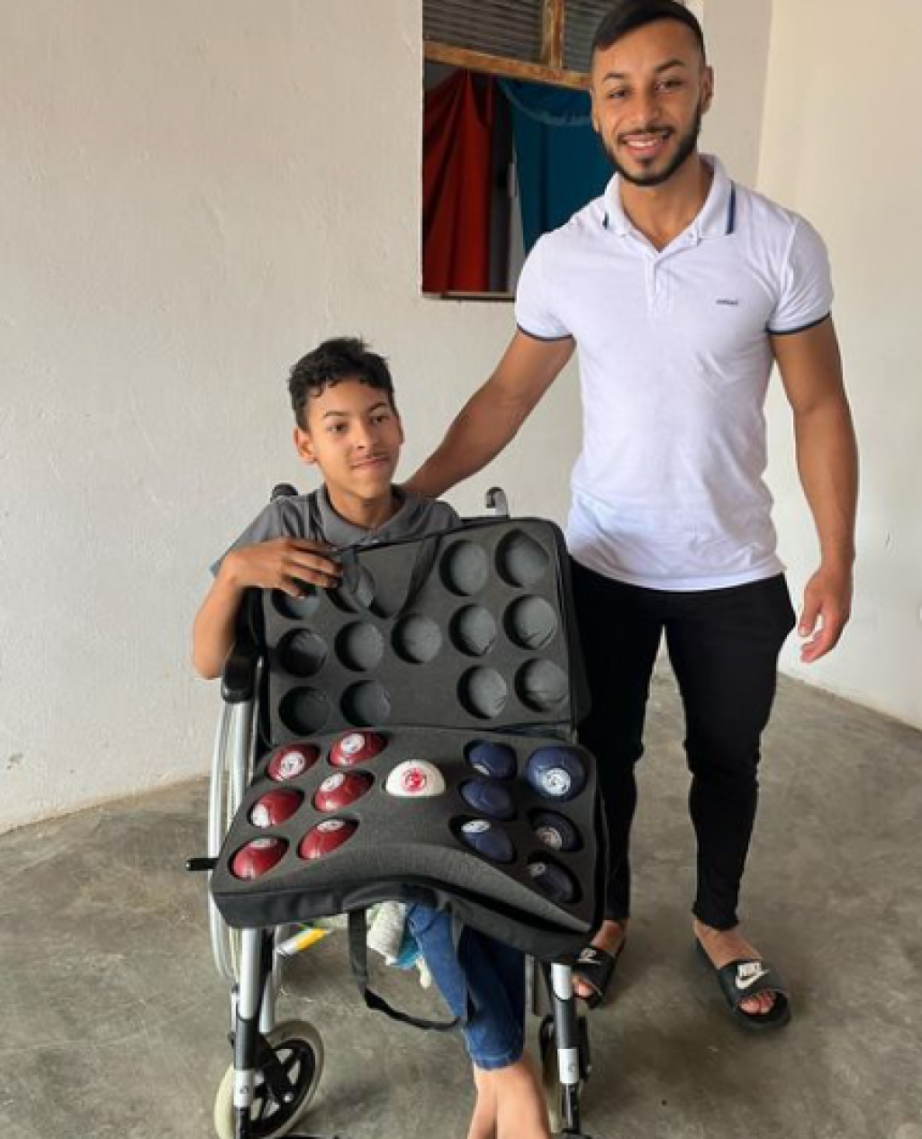 O Kit de Bolas de Bocha em couro legítimo é costurado a mão, acompanha 06 bolas vermelhas, 06 bolas azuis e 01 bola branca; além de uma maleta adaptada. Pedrinho poderá a partir de hoje treinar em casa, sem necessitar de empréstimo de bolas.