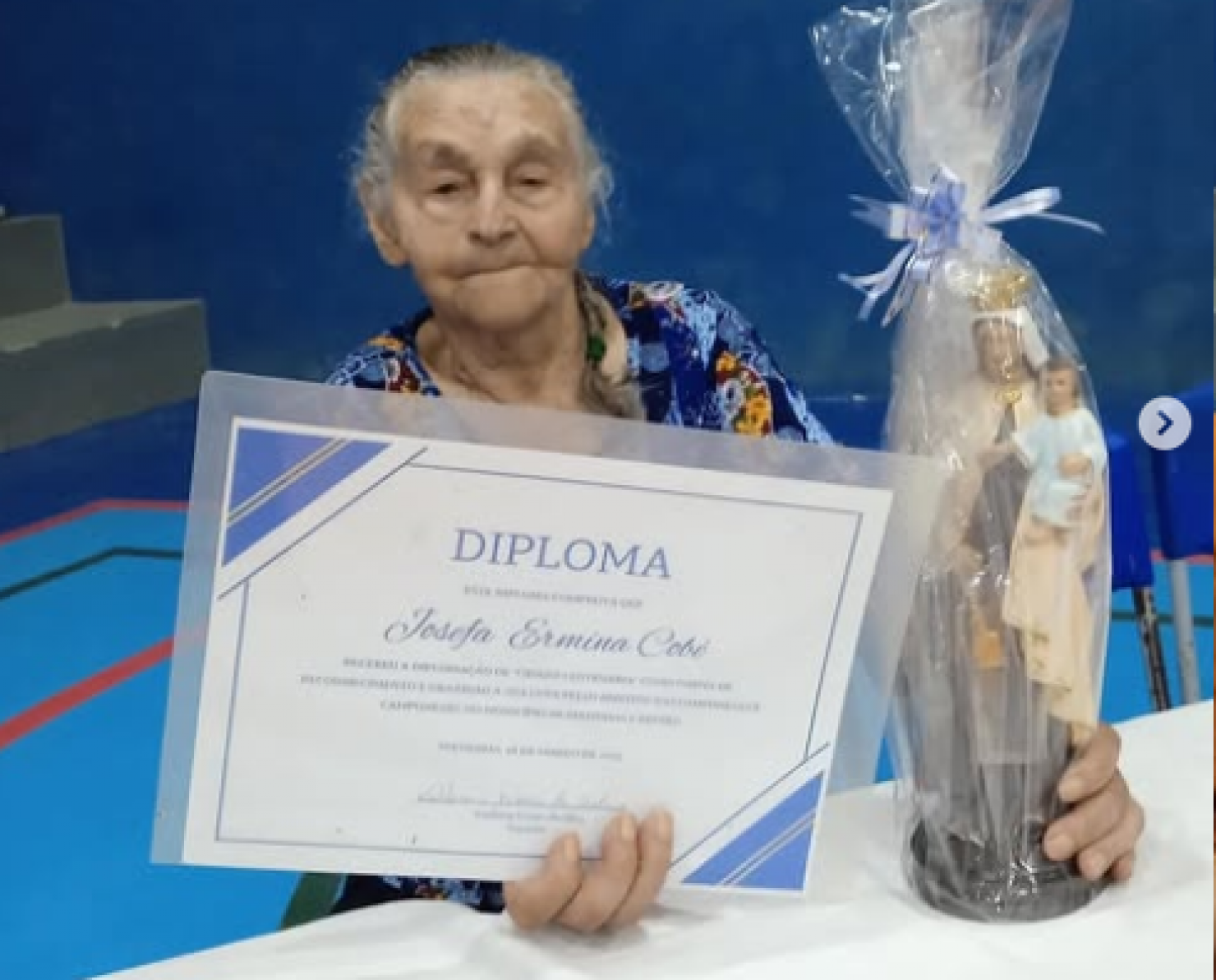 O título de diplomação, de autoria da Vereadora Dra. Fátima Feitosa, foi entregue a Dona Nem por ter feito um grande trabalho de luta camponesa no município. Nem Cobé também foi parteira e grande líder religiosa, sempre lutou por dias melhores para os agricultores e direitos das mulheres de Matinhas. Hoje, com muita lucidez, Dona Ermina, aos 104 anos, recebe este diploma de reconhecimento.
