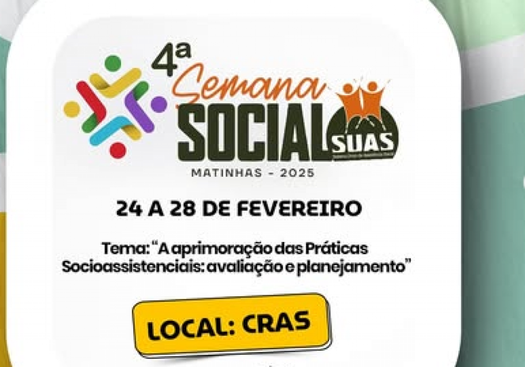 A Prefeitura de Matinhas, através da Secretaria Municipal de Assistência Social (SEMAS), promove de 24 à 28 fevereiro, no Centro de Serviços Socioassistenciais, a “4ª Semana Social do Suas em Matinhas - Tema: “A aprimoração das Práticas Socioassistenciais: avaliação e planejamento”. O encontro visa qualificar os colaboradores da Secretaria de Assistência Social.