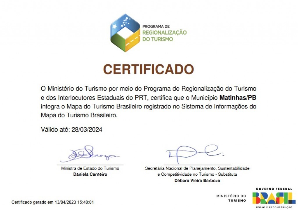 Matinhas e mais 7 municípios do Fórum Regional de Turismo do Brejo, que compõem uma instância de governança (IGR) foram os primeiros a renovar o Programa de Política do Ministério do Turismo, permanecendo no Mapa do Turismo Brasileiro.